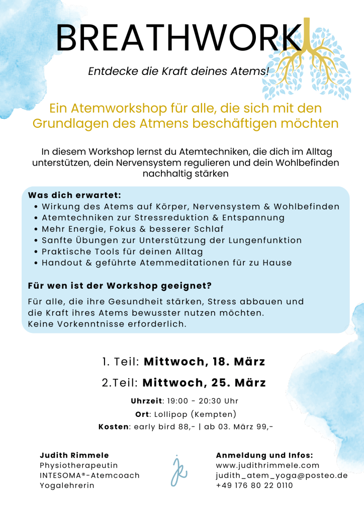 Momentan biete ich regelmäßig Yoga, Atemworkshops, Atemcoachings und Transformative Atemsessions (Breathwork) online über Zoom und live in Kempten (Allgäu) und Vogt an.